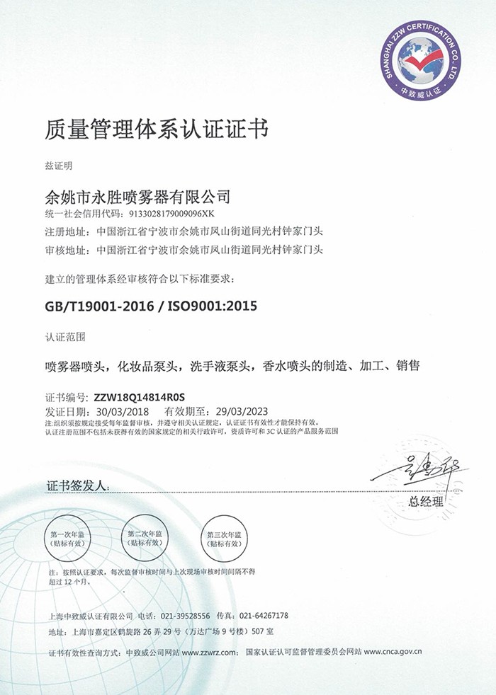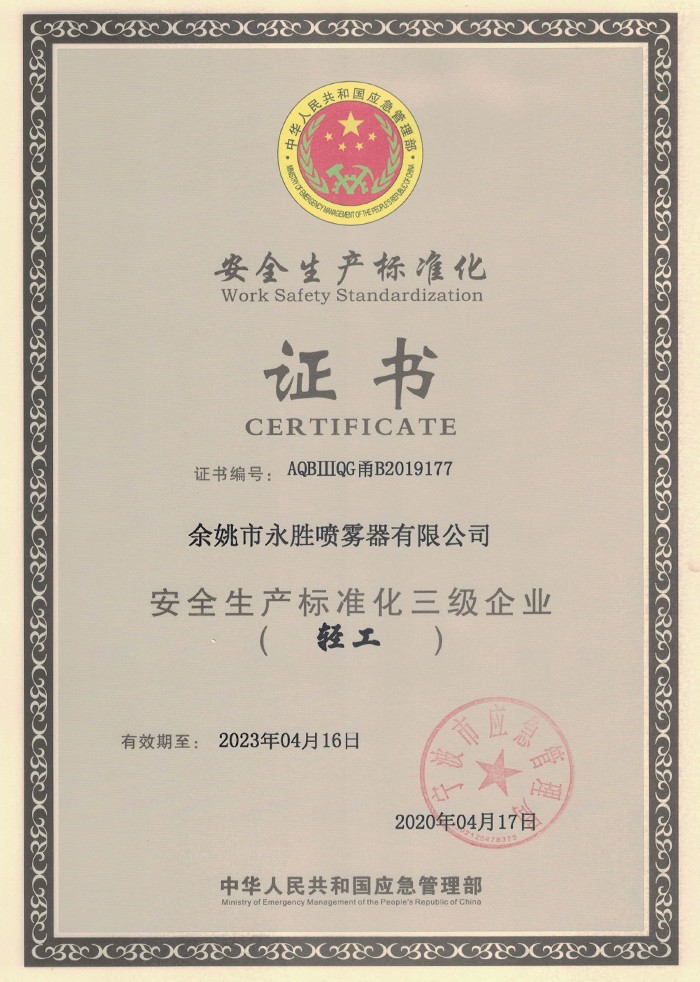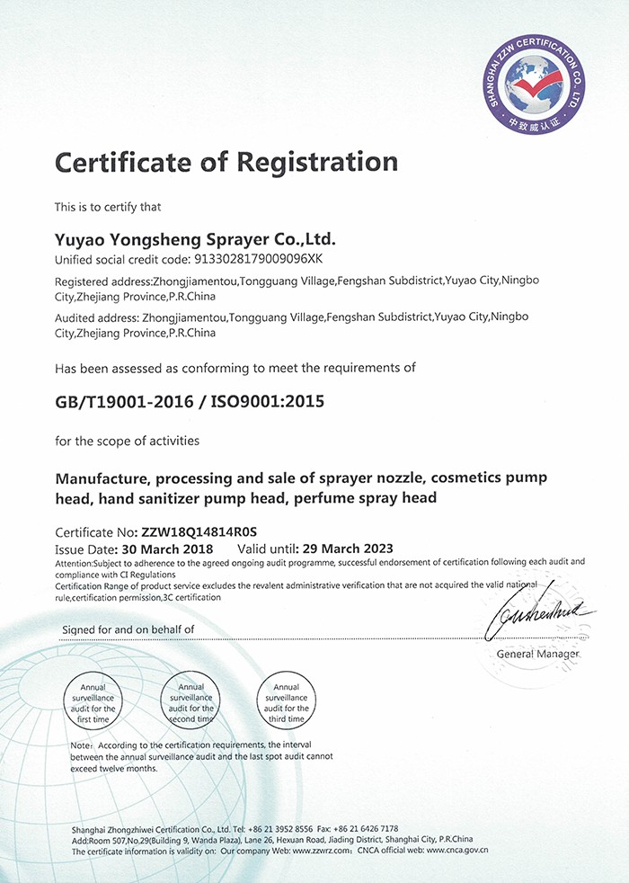 Yuyao Yongsheng Sprayer Co., Ltd. Based on Yuyao Yongsheng Plastic & Hardware Factory, founded in 2001, is a professional manufacturer specialized in pressure spayer, plastic sprayer& botle, trigger sprayer, lotion pump, mist spayer & other relevant OEM or 0DM customer-making plastic products.